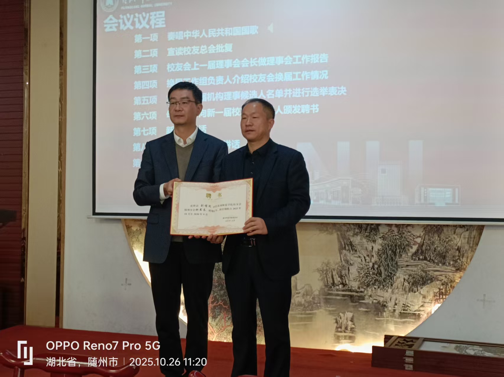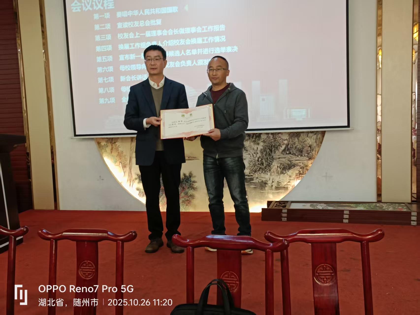 陈朝阳代表学校向大会成功召开及新当选理事会成员表示祝贺,并向全体随州校友致以诚挚问候。他在讲话中介绍了学校在学科建设、人才培养与服务社会等方面取得的最新成绩。他指出,校友是学校最珍视的财富与名片,学校将始终关注并支持随州校友成长,全力支持新一届校友会工作。他诚挚邀请随州校友回校参加建校120周年系列活动,并希望随州校友会继续发挥桥梁纽带作用,凝聚人心、汇聚力量,共同开创学校与校友事业发展的新局面。