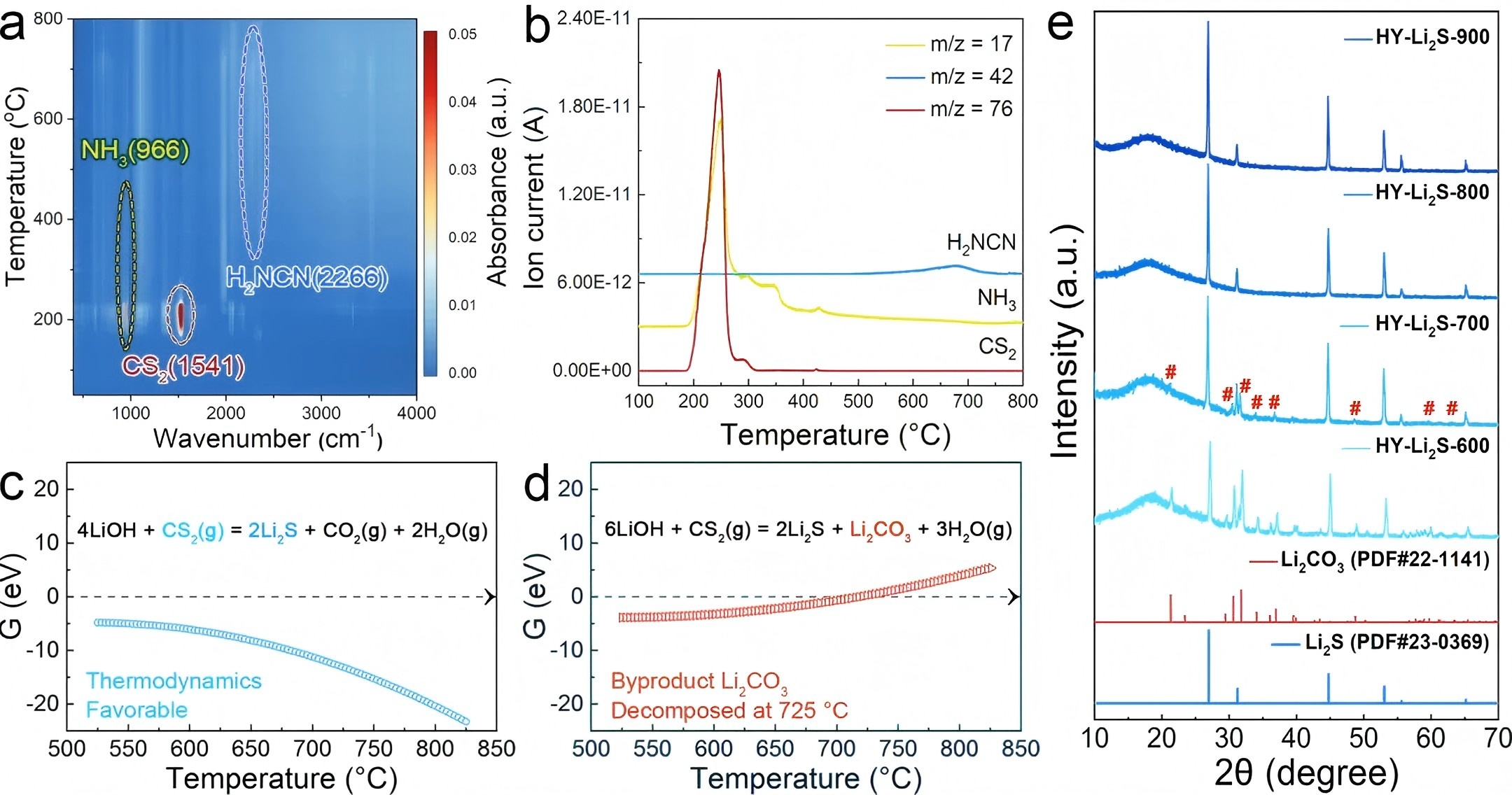 ▲不同温度下绿色无溶剂法制备Li2S的反应机理示意图和实验验证