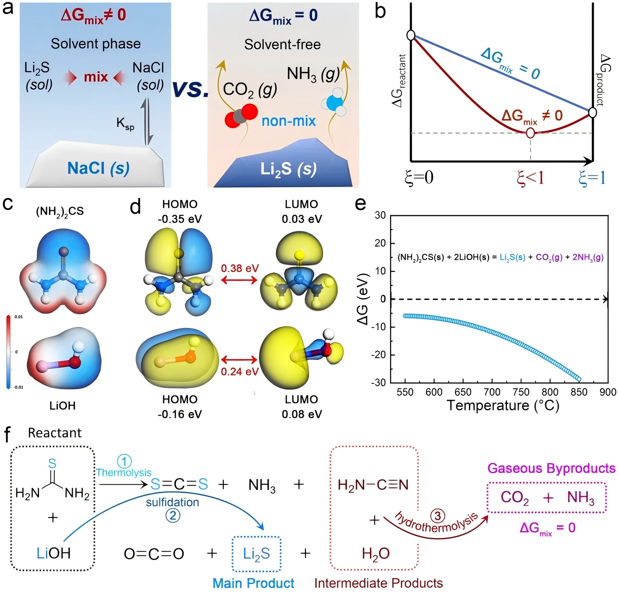 该研究成果提出了一种无溶剂复分解反应(metathesis)法,利用廉价、安全的硫脲(thiourea)作为S2⁻供体与LiOH反应,在无溶剂体系下直接生成高纯 sLi2S, 并伴随CO2与NH3气体自发逸出,从而避免了传统液相法中ΔGmix引起的平衡限制,实现反应完全转化与高纯产物获得。