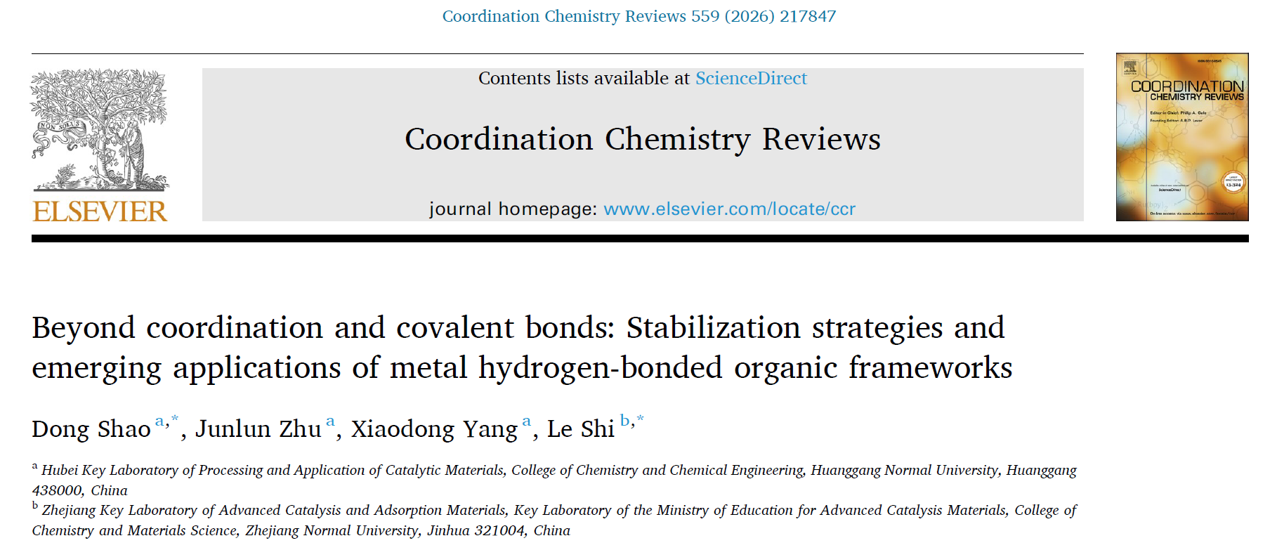 近日,我校化学化工学院教师邵东副教授课题组在国际著名期刊《Coordination Chemistry Reviews》(影响因子:23.5,中科院一区Top期刊)上发表题为“Beyond coordination and covalent bonds: Stabilization strategies and emerging applications of metal hydrogen-bonded organic frameworks”的综述论文,邵东副教授是论文第一作者和通讯作者,黄冈师范学院为论文第一署名单位。黄冈师范学院祝俊伦副教授、杨小东副教授以及浙江师范大学史乐特聘教授参与了该工作的发表。该综述的发表标志着学校在多孔材料研究领域的国际影响力进一步提升。